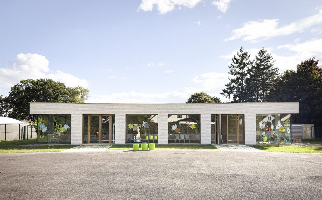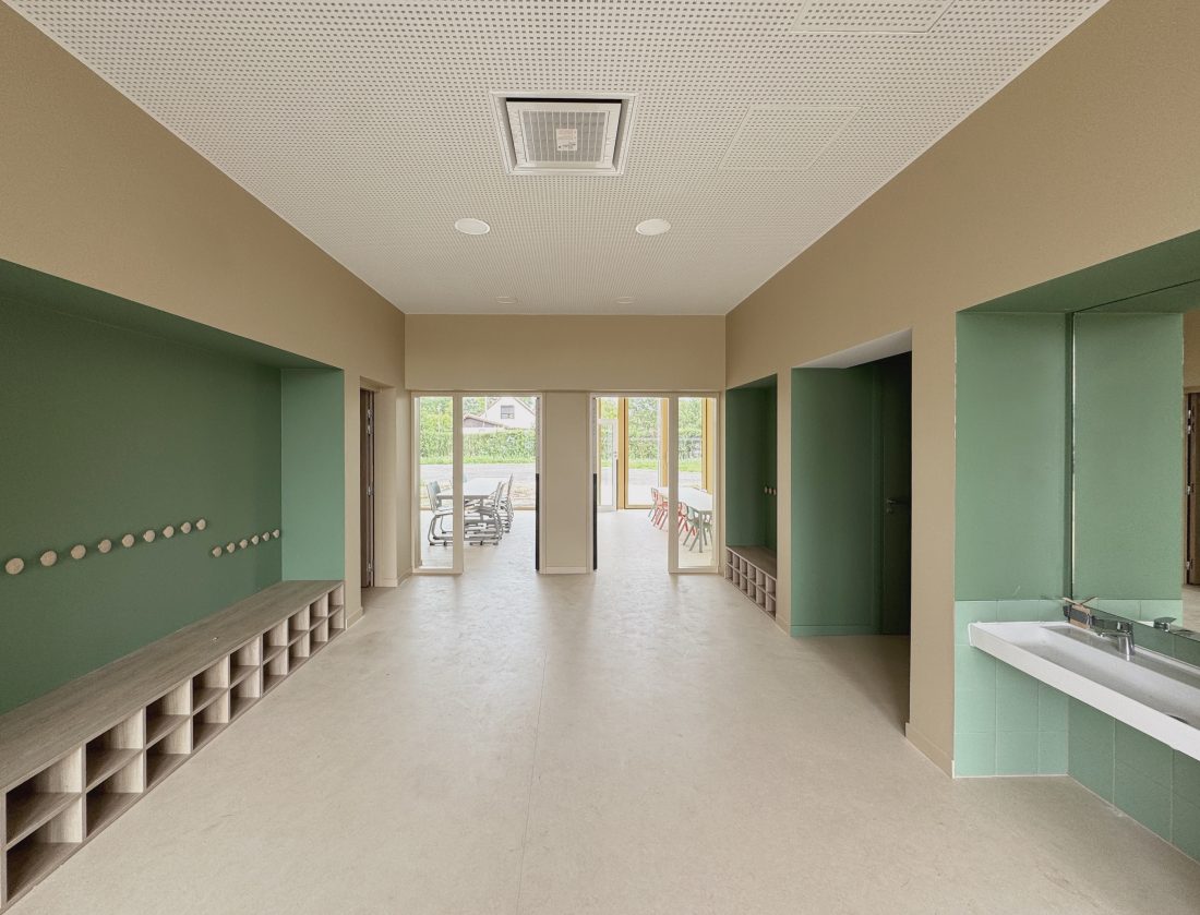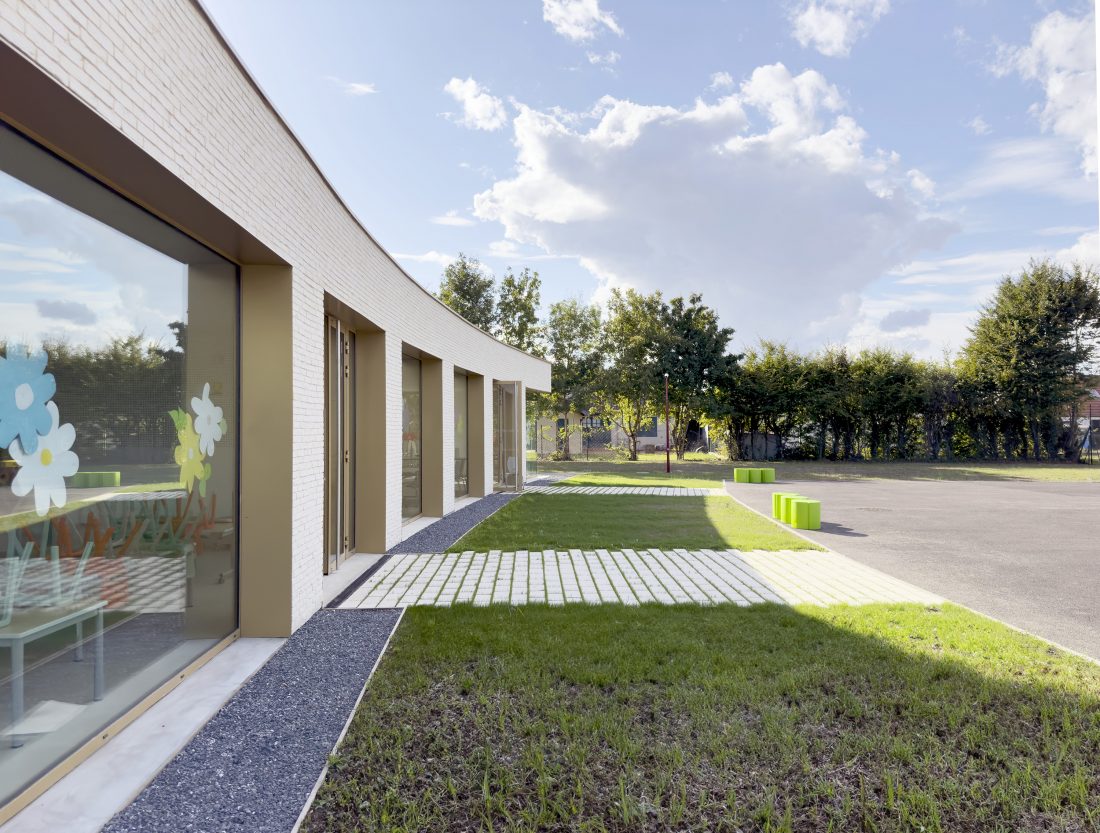 Situé entre l’aire de jeux et la cour, le bâtiment aux façades concaves oriente les espaces sur ces aménagements.